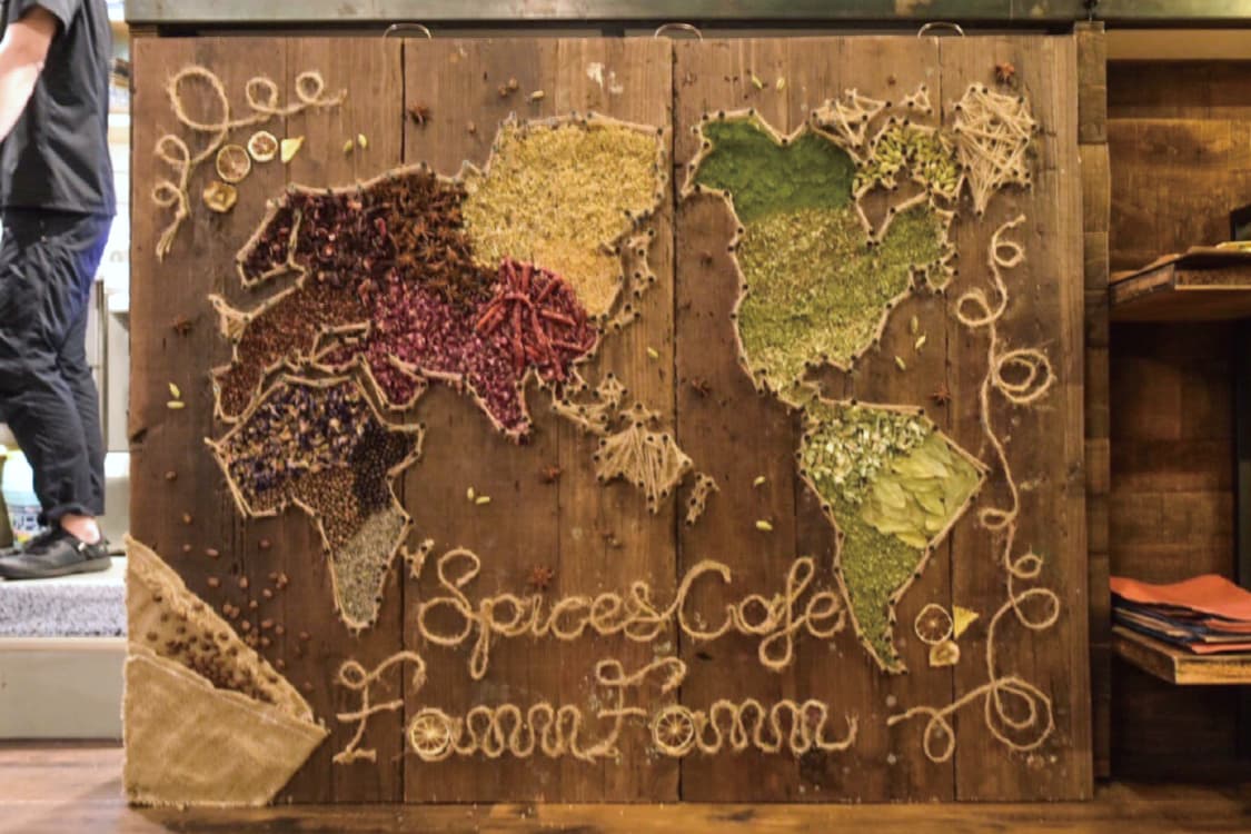 代官山のSpice & Cafe FamFamのビジュアルボード制作しました。豊富なスパイスを用いた料理を提供するサービス内容をスパイスを使った世界地図で表現した。 I made a visual board for Spice & Cafe FamFam in Daikanyama. A world map using spices expresses the service content that provides dishes using abundant spices.