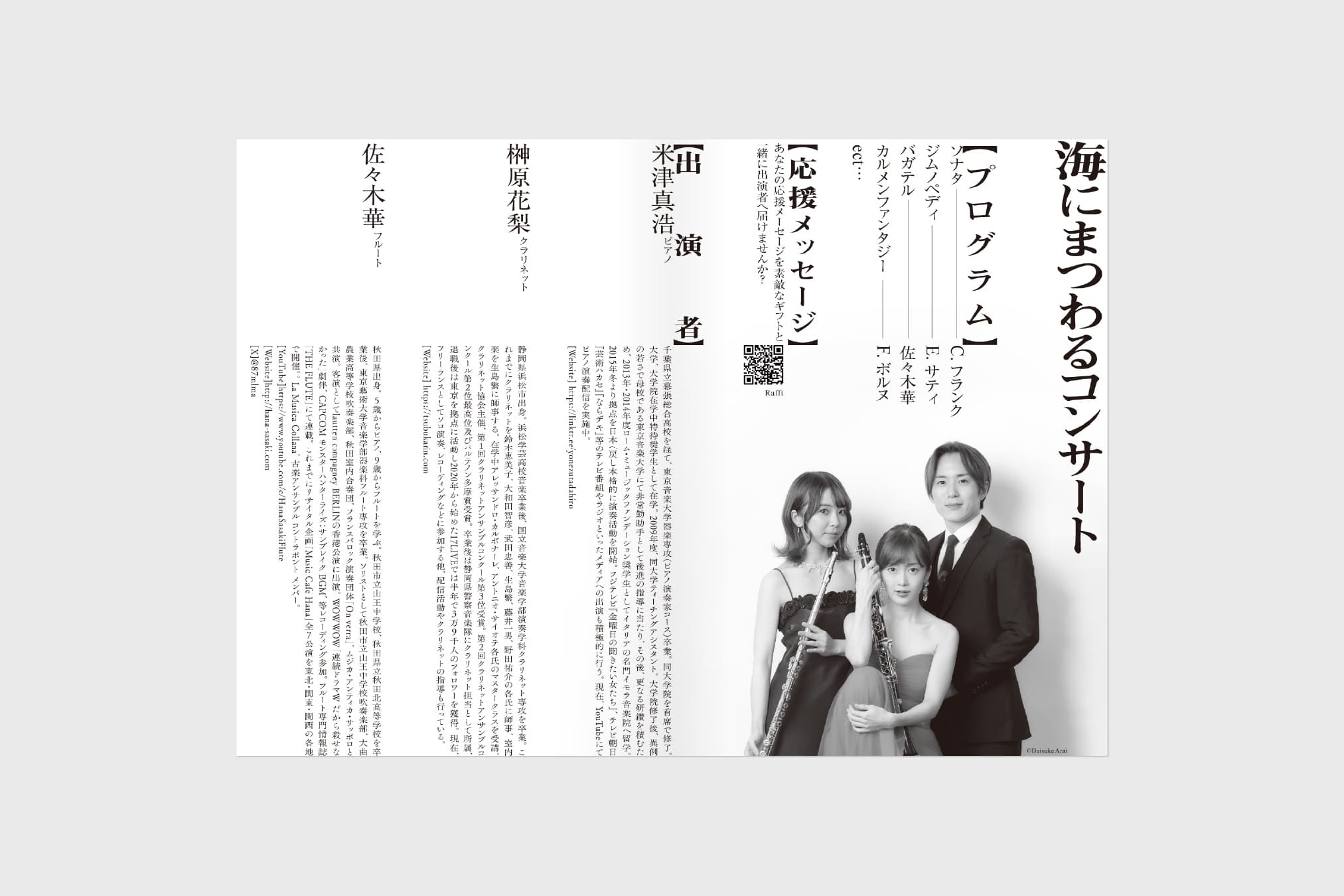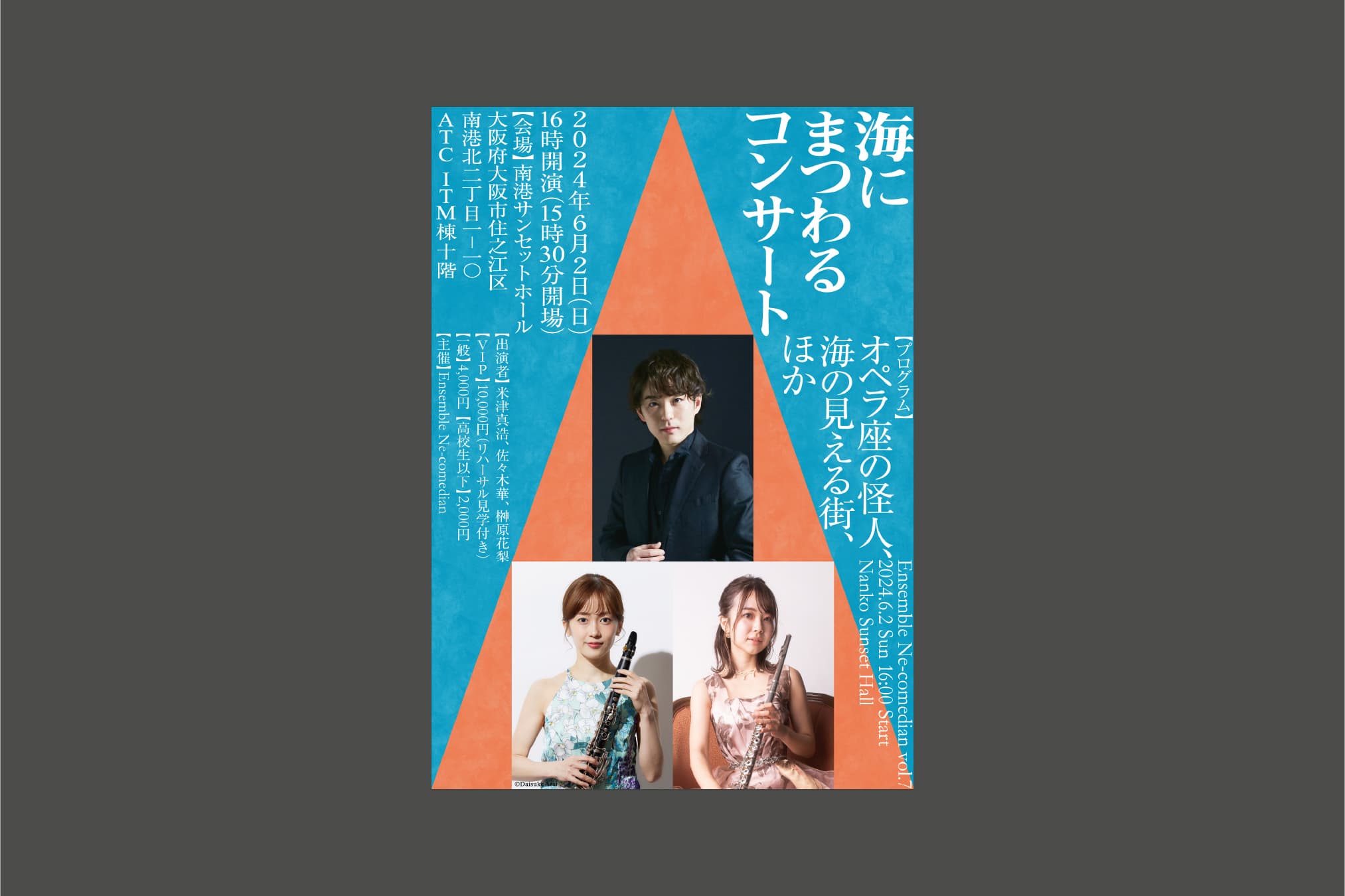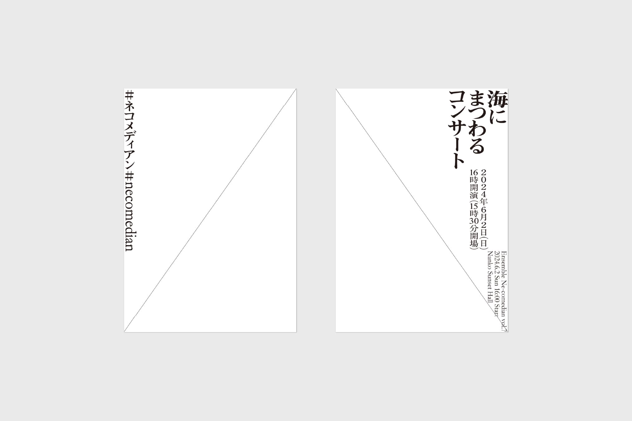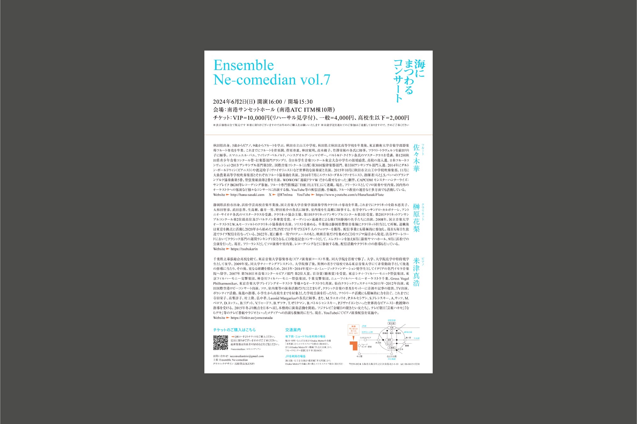 Ensemble Ne-comedian vol.7の宣伝美術を担当しました。今回の演奏会場である南港サンセットホールから見える景色と音楽に心躍らせ期待している来場者はきっと多いはずです。そこで特徴的な会場の構造やグリッド感のある窓、演者の位置関係などを紙面に持ち込むことで来場者が当日体験するような景色を再現し、期待感を高めるようなデザインを目論みました。 I was in charge of the advertising art for Ensemble Ne-comedian vol.7. I'm sure there will be many visitors excited and looking forward to the scenery and music from Nanko Sunset Hall, the venue for this performance. Therefore, by incorporating the unique structure of the venue, the grid-like windows, and the positional relationships of the performers into the paper, we aimed to create a design that would recreate the scenery that visitors would experience on the day and heighten their expectations.