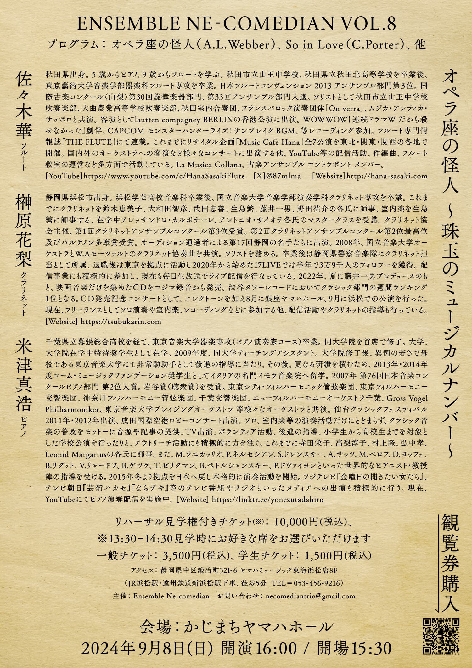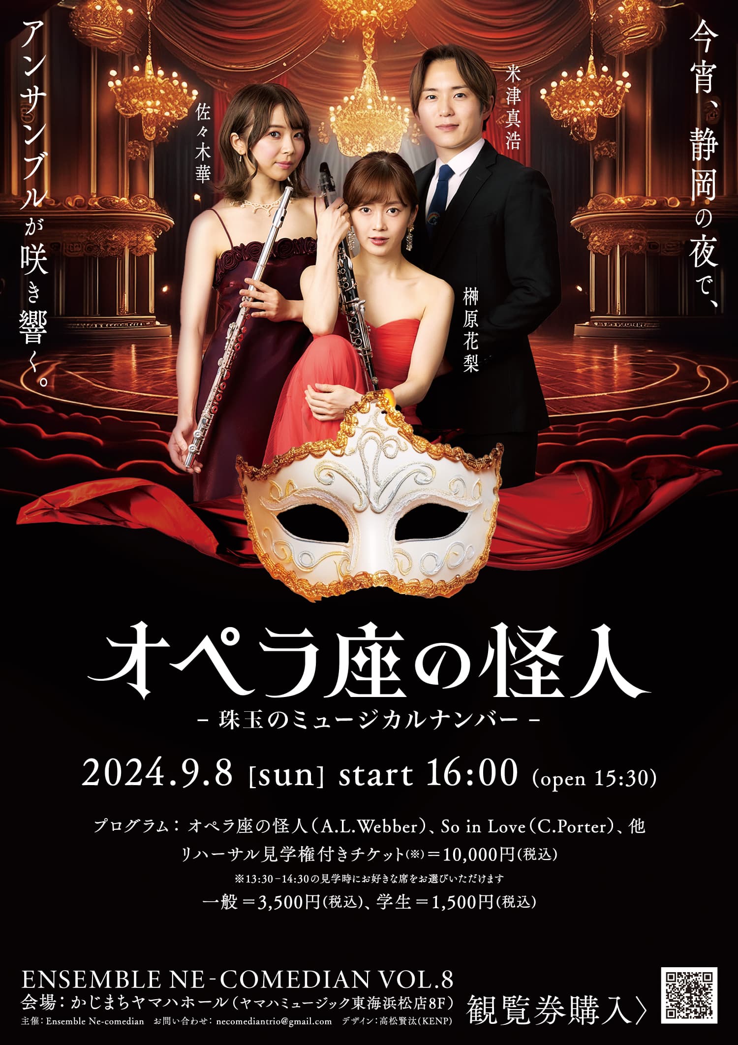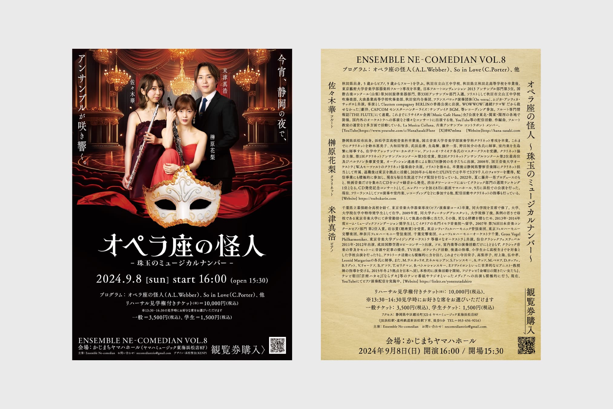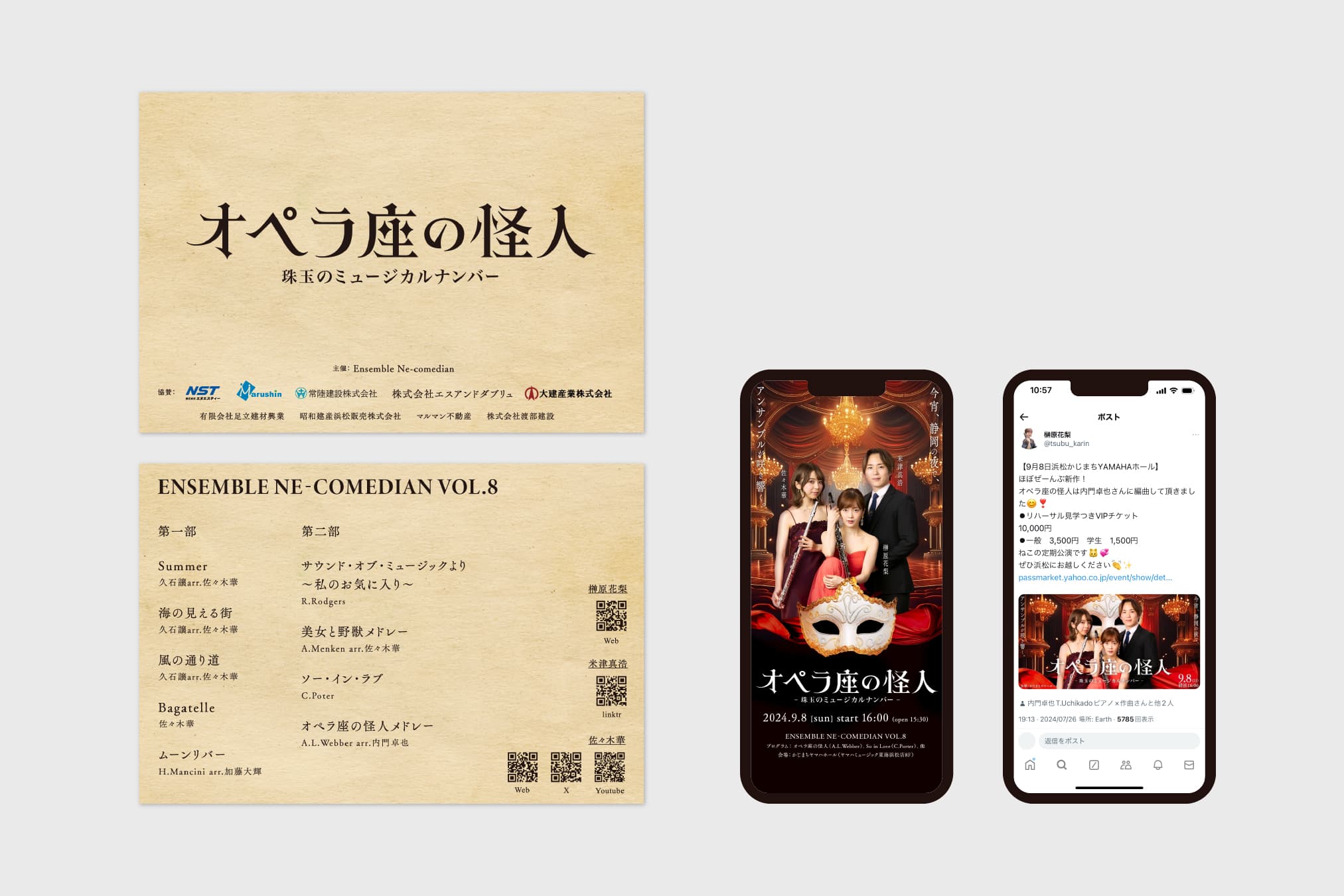 Ensemble Ne-comedian vol.8の宣伝美術を担当しました。オペラ座の怪人にちなんだプログラム構成と題目に寄り添い、独自のロゴタイプを中心にオペラ座の怪人の奇怪で優雅な印象にデザインを設計しています。 I was in charge of the promotional art for Ensemble Ne-comedian vol.8. The design is based on the program structure and title of the show, which are all related to The Phantom of the Opera, and is centered around a unique logotype, creating a strange yet elegant impression of the Phantom of the Opera.