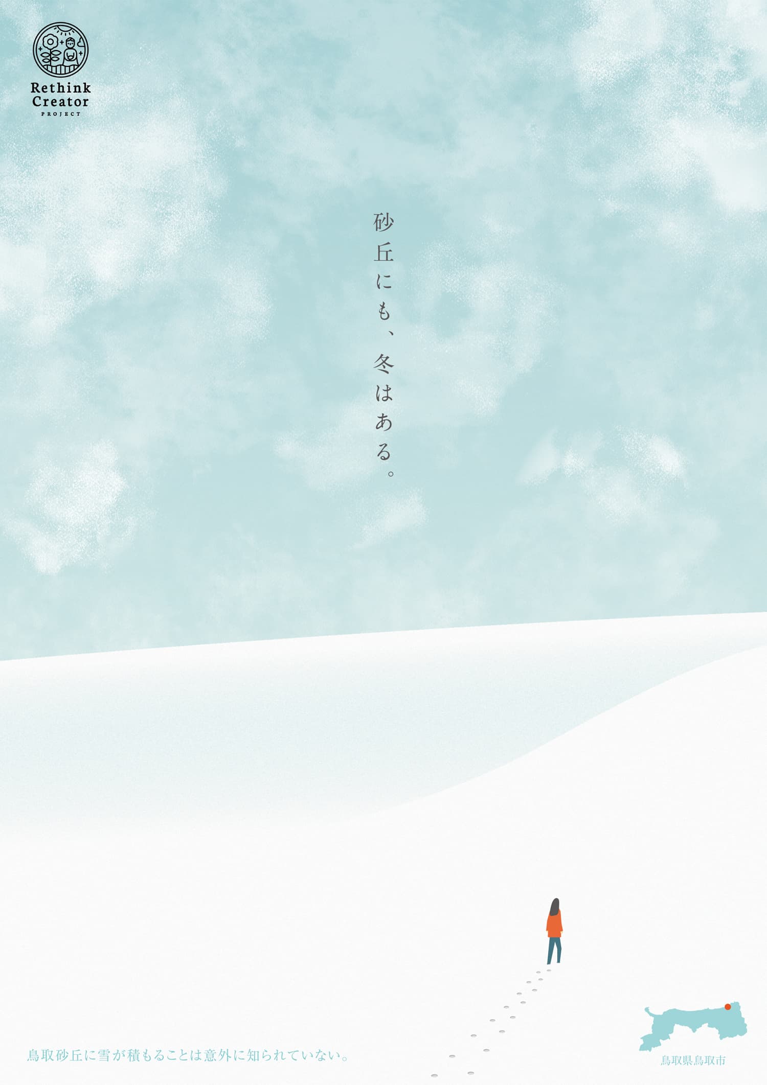 Rethink Creative Contest 2022 で地元PR賞をいただいたポスターデザインです。コンテストテーマとして与えられた「あなたの地元の意外と知られていないこと」に対して出身地である鳥取の景観に注目しデザインしました。 This is a poster design that won the local PR award at the Rethink Creative Contest 2022. I focused on the scenery of Tottori, my hometown, and designed it for the theme of the contest, "What is surprisingly unknown about your hometown?"