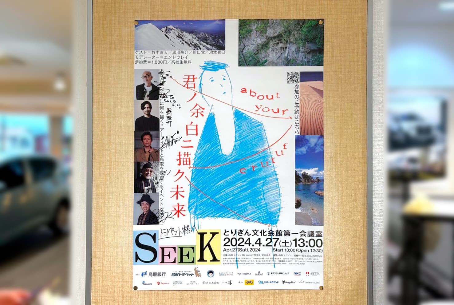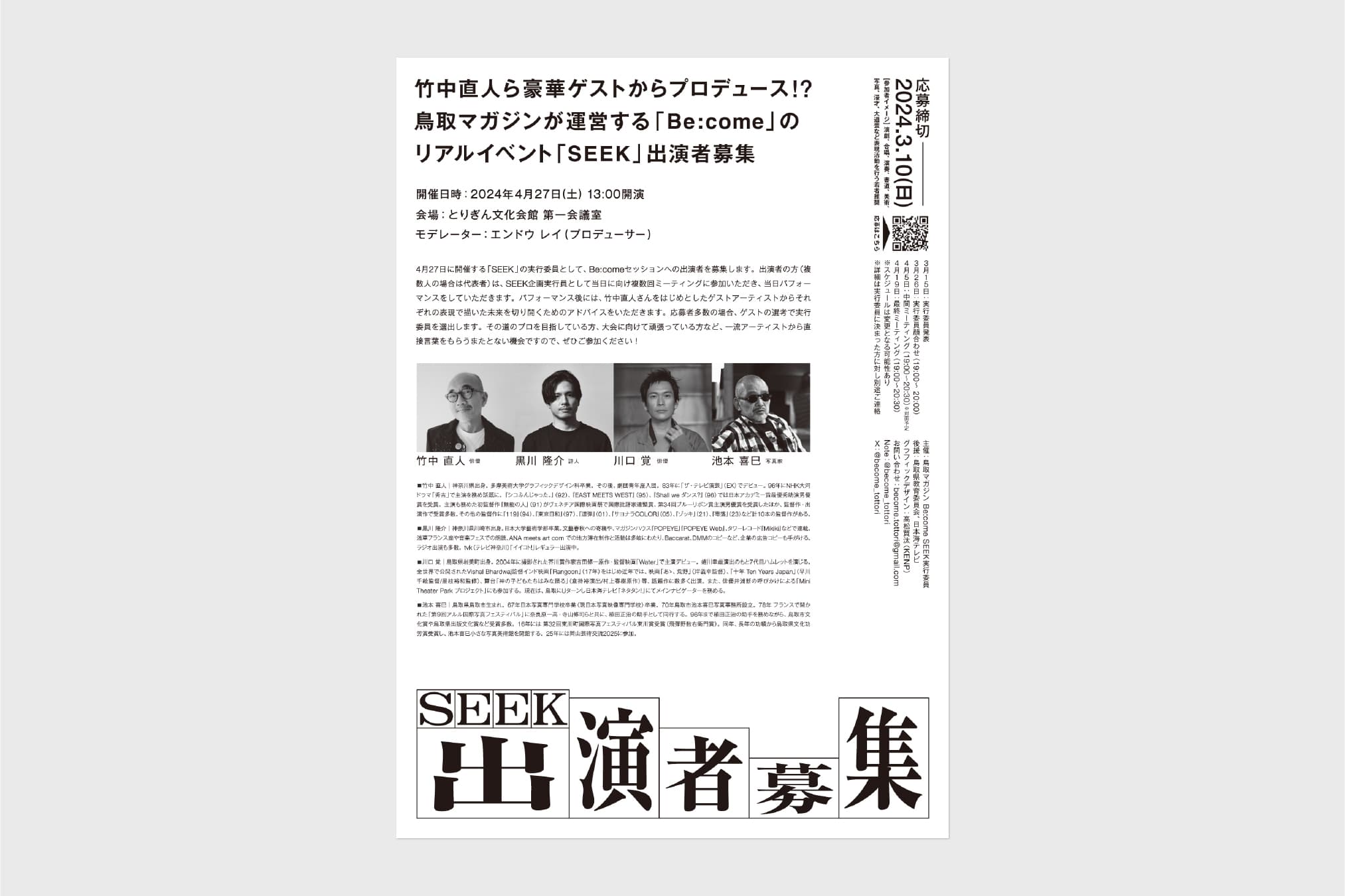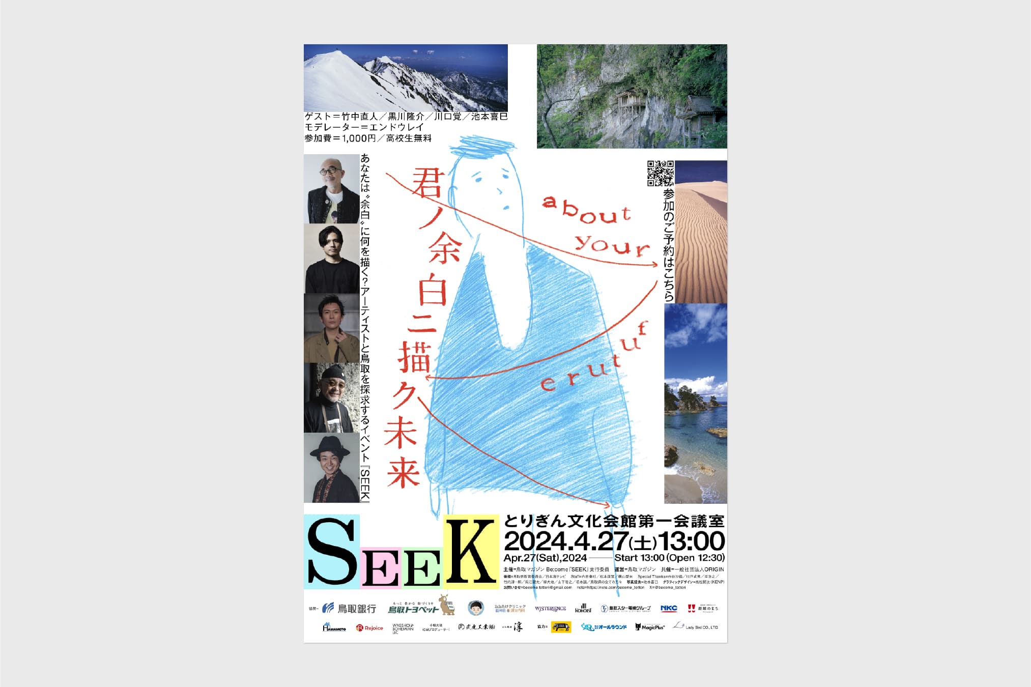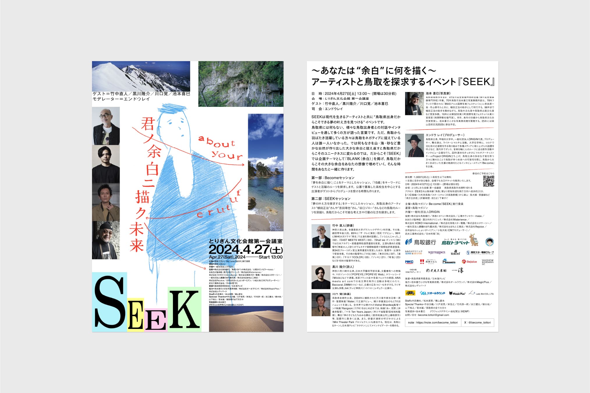 KENPが宣伝美術を担当しているBe:comeのリアルイベント「SEEK」のフライヤー、ポスターデザインを制作しています。本イベントのテーマである余白=BLANKに盛り込まれた思いに寄り添い、「私を成す鳥取の環境と余白=余白のキャンバス」という宣伝美術コンセプトを開発し、視覚的な表現に落とし込みました。 We are creating flyers and poster designs for Be:come's real event "SEEK", for which KENP is in charge of advertising art. In keeping with the theme of this event, BLANK, we developed the advertising art concept of ``Tottori's environment and blank spaces that make up who we are = blank canvas'' and translated it into visual expression.