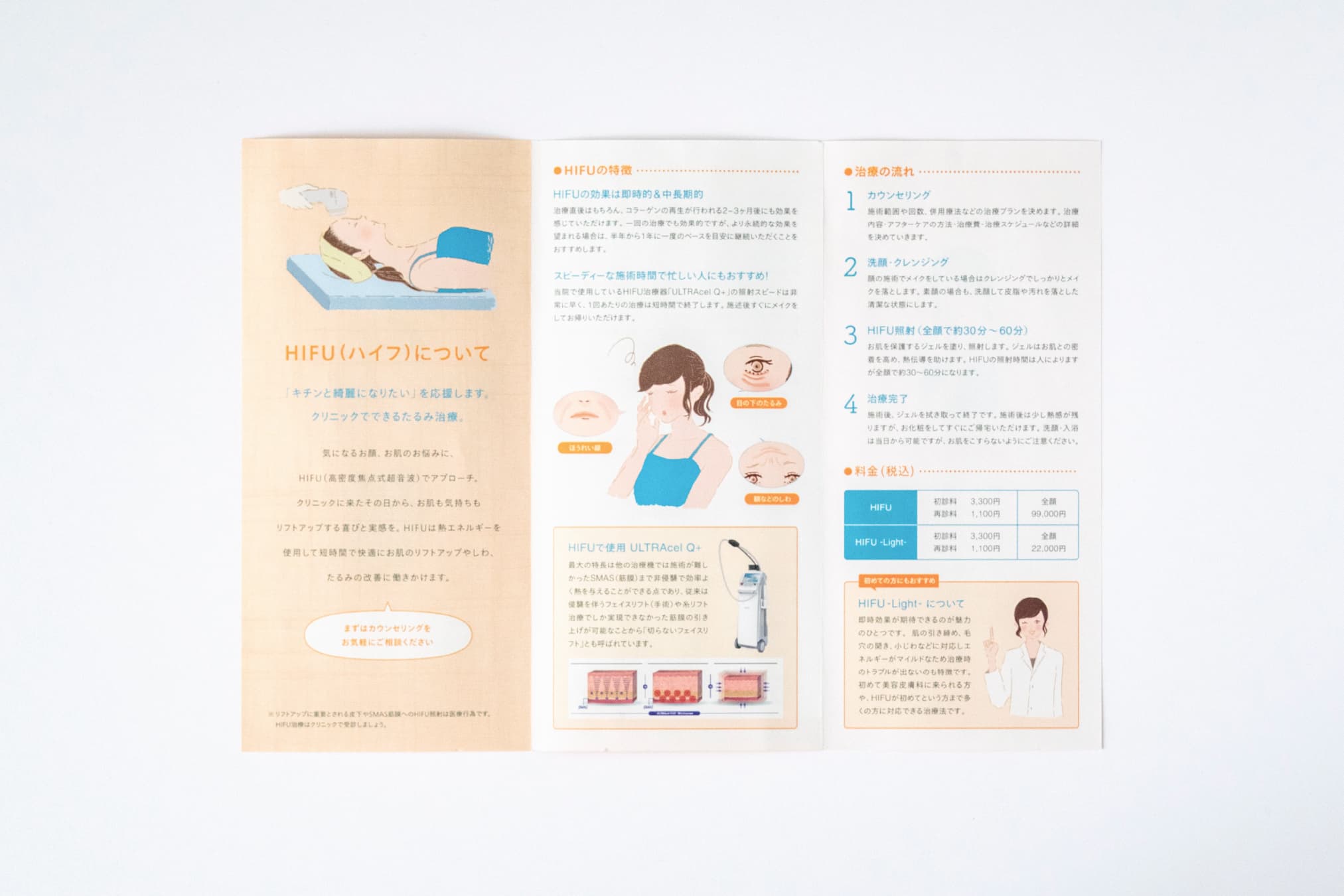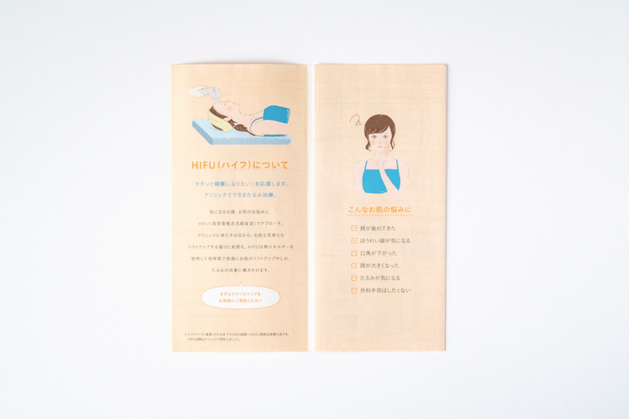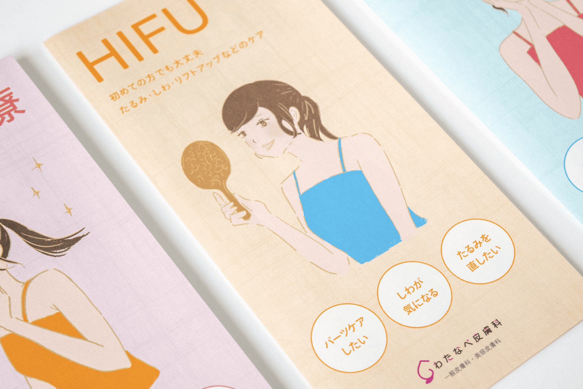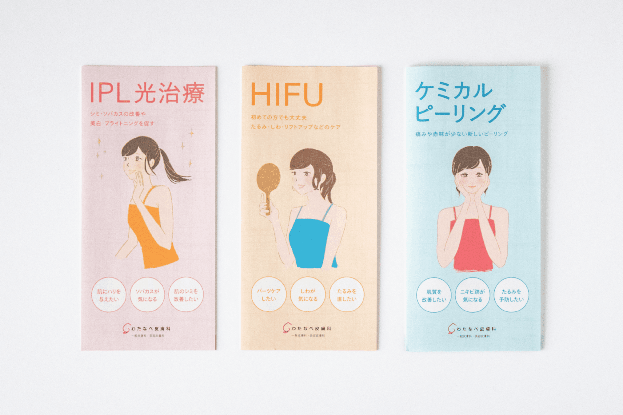 わたなべ皮膚科は横浜市にある病院で、一般皮膚科だけでなく美容皮膚科、AGA他にも対応しています。KENPでは美容皮膚の治療法として用いられるHIFU(ハイフ)、IPL光治療、ケミカルピーリングのリーフレット、ならびにポスターのデザインを担当しました。皮膚をモチーフに開発した柔らかなテクスチャーと優しい色彩で構成されたデザインとすることで、同院の地域に根付した親しみやすい雰囲気を表現しています。また、イラストの採用は受診のハードルと抵抗感を下げること、目に留めやすくすることを期待しています。院内の掲示板にポスターを連貼りすることで実際に見てくださる方や、リーフレットを手にとってくれる方の増加に貢献したデザイン。 Watanabe Dermatology is a hospital located in Yokohama City, and not only general dermatology but also cosmetic dermatology, AGA, etc. At KENP, I was in charge of designing leaflets and posters for HIFU, IPL phototherapy, and chemical peeling, which are used as cosmetic skin treatments. The soft textures and gentle colors of the skin motif create a design that expresses the friendly atmosphere rooted in the hospital's community. In addition, we hope that the use of illustrations will reduce the hurdles and resistance to medical examinations and make them easier to notice. A design that contributes to increasing the number of people who actually see the posters and the number of people who pick up the leaflet by pasting the posters on the bulletin board in the hospital.