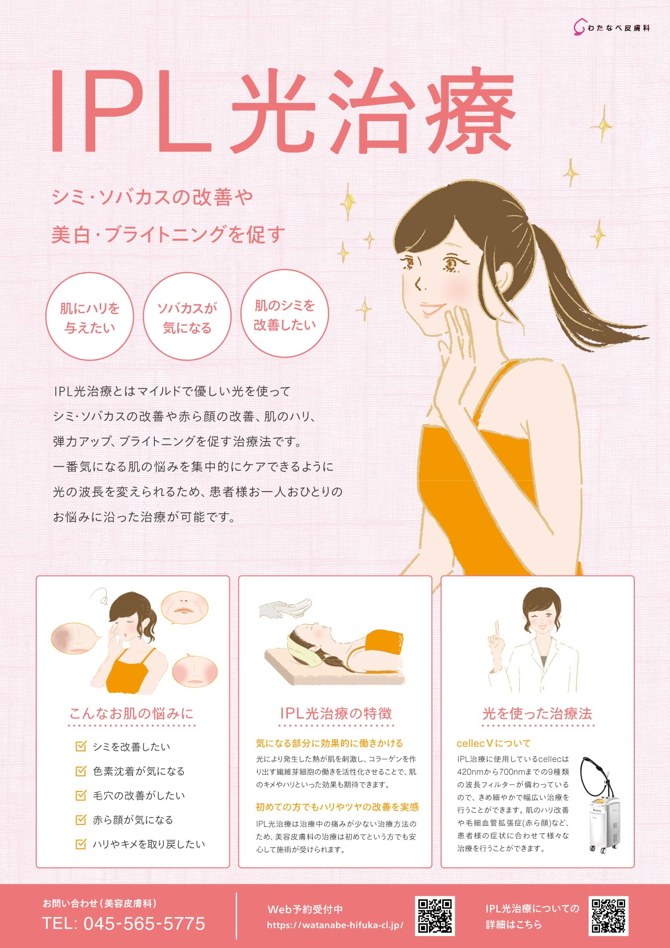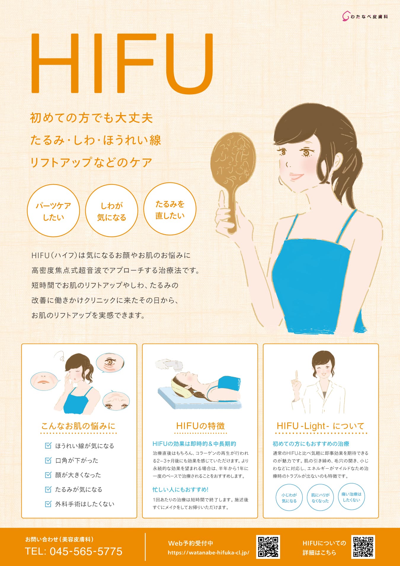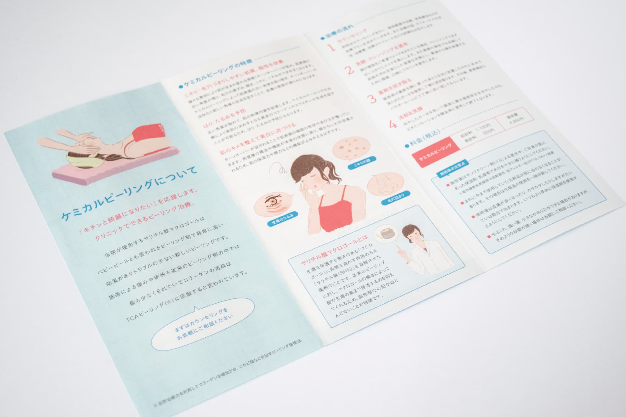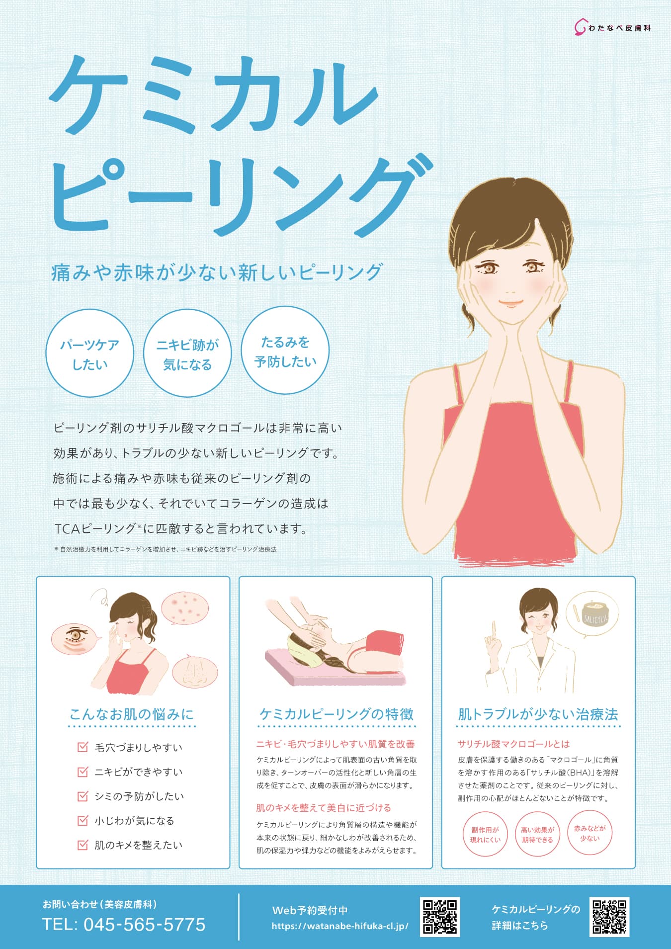 わたなべ皮膚科は横浜市にある病院で、一般皮膚科だけでなく美容皮膚科、AGA他にも対応しています。KENPでは美容皮膚の治療法として用いられるHIFU(ハイフ)、IPL光治療、ケミカルピーリングのリーフレット、ならびにポスターのデザインを担当しました。皮膚をモチーフに開発した柔らかなテクスチャーと優しい色彩で構成されたデザインとすることで、同院の地域に根付した親しみやすい雰囲気を表現しています。また、イラストの採用は受診のハードルと抵抗感を下げること、目に留めやすくすることを期待しています。院内の掲示板にポスターを連貼りすることで実際に見てくださる方や、リーフレットを手にとってくれる方の増加に貢献したデザイン。 Watanabe Dermatology is a hospital located in Yokohama City, and not only general dermatology but also cosmetic dermatology, AGA, etc. At KENP, I was in charge of designing leaflets and posters for HIFU, IPL phototherapy, and chemical peeling, which are used as cosmetic skin treatments. The soft textures and gentle colors of the skin motif create a design that expresses the friendly atmosphere rooted in the hospital's community. In addition, we hope that the use of illustrations will reduce the hurdles and resistance to medical examinations and make them easier to notice. A design that contributes to increasing the number of people who actually see the posters and the number of people who pick up the leaflet by pasting the posters on the bulletin board in the hospital.